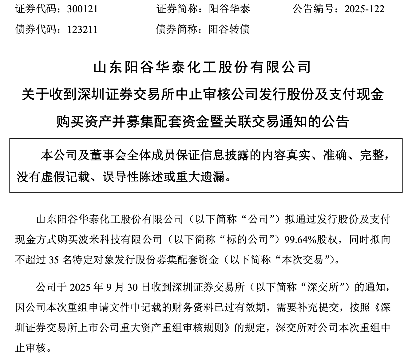 阳谷华泰表示,本次重组中止审核对公司本次重组不构成实质性影响。公司将继续推进本次重组事项,全力协调各中介机构落实加期审计等相关工作,尽快完成财务数据更新并及时申请恢复审核。